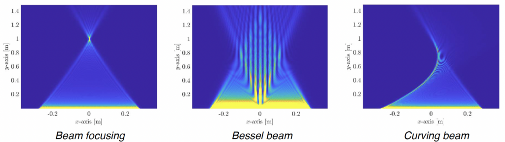 アンテナアレイサイズの拡大によって、平面波近似が成立せず、波面を球面として取り扱う必要性のある近傍界における通信が注目を集めています。近傍界では、遠方界では実現できない様々なビームが形成可能であることが知られており、世界的に研究が活性化しています。我々の研究室では、近傍界における新しいビーム形成技術の実用化を目指し、自己修復特性をもつベッセルビームのフェーズドアレイによる形成・制御、空間でビームが曲がるカービングビームの最適化、安定的にエネルギーをピンポイントに集中させるロバストビーム焦点といった技術を提案、開発しています。